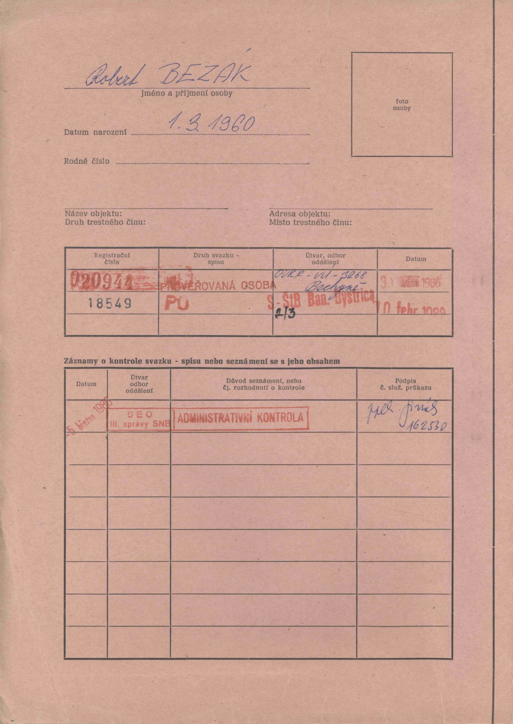 V rukách prvýkrát drží utajovaný spis, ktorý zachytáva, ako po ňom išli komunistami ovládané orgány štátnej moci počas jeho vojenčiny v rokoch 1986 až 1987. Denník N ho získal z archívu Ústavu pamäti národa. Bezáka evidovali pod krycím menom Sebastián.