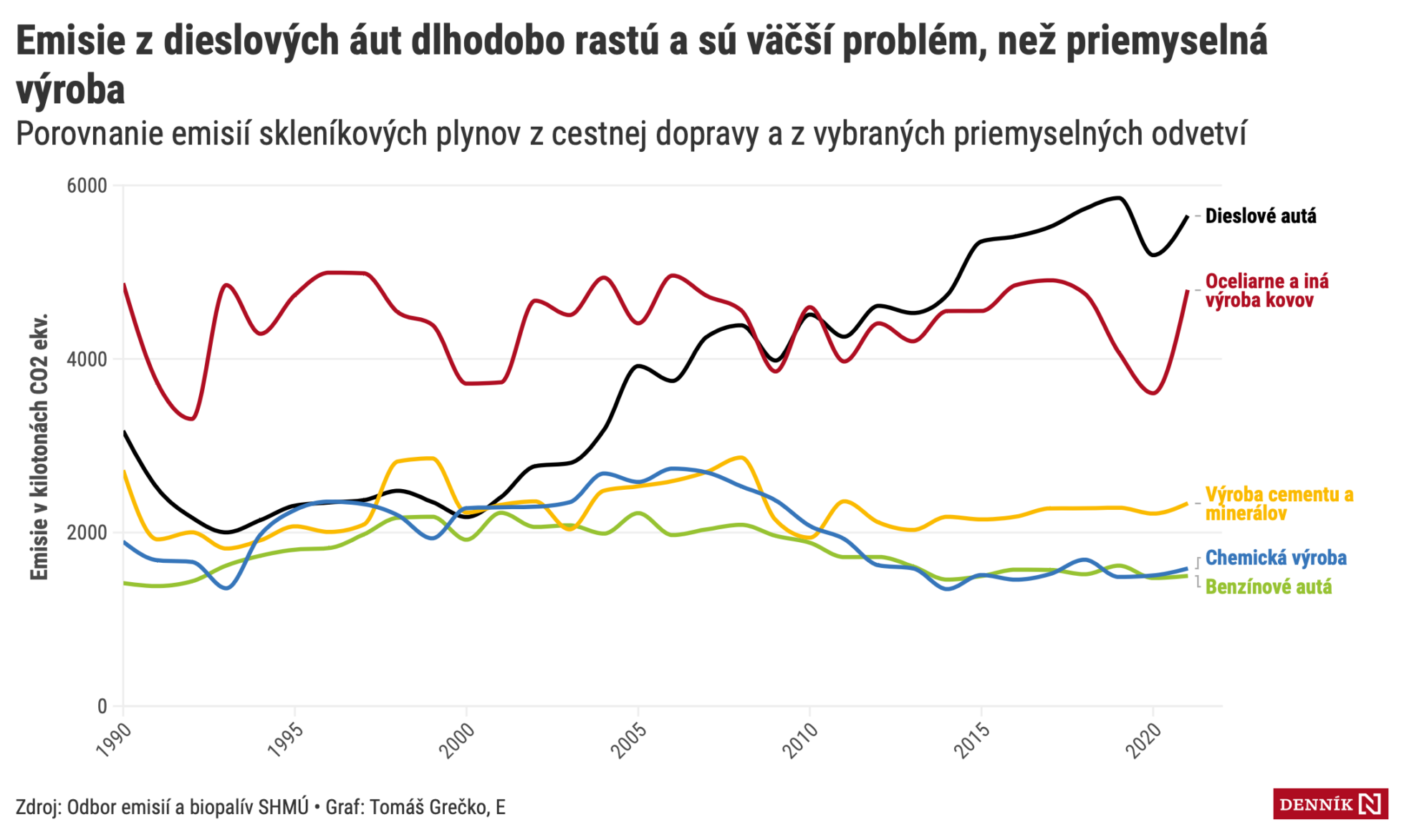 Dieselové autá na slovenských cestách sú zodpovedné za viac skleníkových plynov než najväčší znečisťovatelia v priemysle, ukazuje Graf dňa z údajov SHMÚ. Hoci autá sú čoraz úspornejšie, jazdí sa viac a po cestách sa vozí viac tovaru.