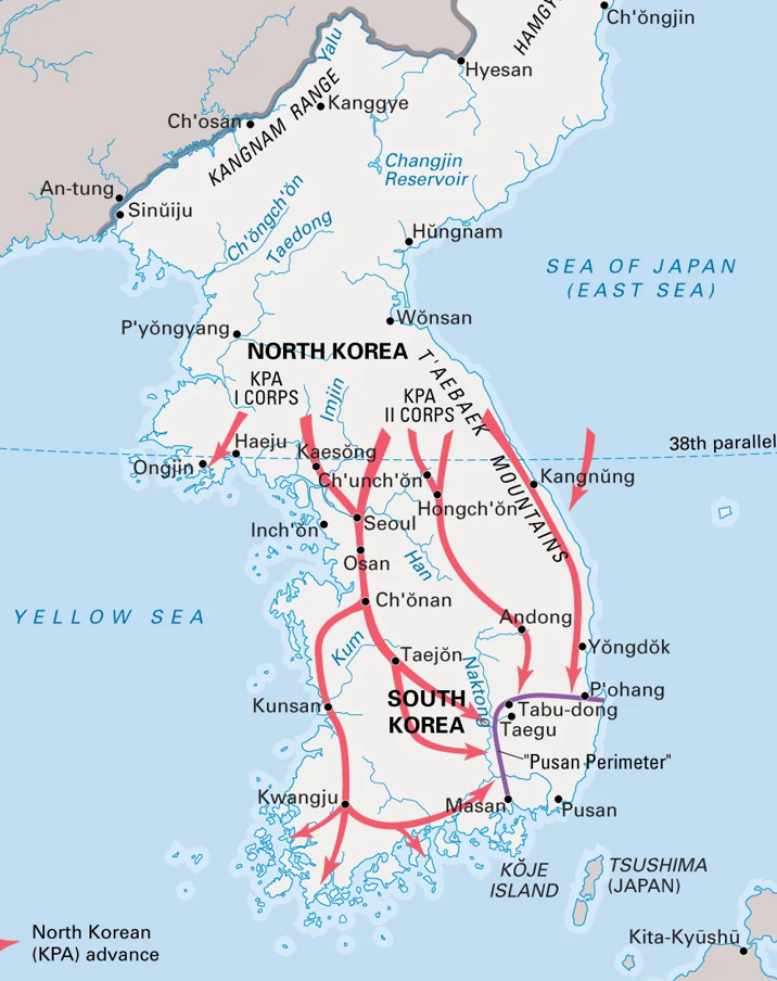 Za takýchto podmienok vojská KĽDR veľmi rýchlo postupovali. Za tri dni padlo hlavné mesto Soul. Ako píše Cumings, cieľom Kim Il-Songa bolo vyhrať vojnu do mesiaca a takmer sa mu to podarilo. Koncom júla juhokórejské sily a Američania, ktorí im prišli na pomoc, držali iba Pusanský perimeter, územie asi 80 krát 80 kilometrov pri prístave na juhovýchode polostrova.