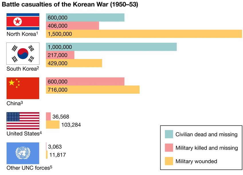 Odhady sa rôznia, ale vo vojne v Kórei zahynuli možno až tri milióny ľudí, viac ako polovica z nich mohli byť civilisti. To je podobné číslo, ako sú horné odhady obetí vojny vo Vietname – rozdiel je v tom, že občianska vojna vo Vietname trvala 20 rokov a Vietnam mal väčšiu populáciu ako obe Kórey počas vojny.