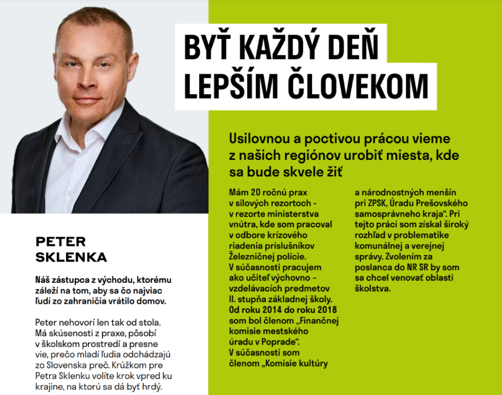 Bývalý policajt z SaS, ktorý učí telocvik na škole, kam chodia len Rómovia, či riaditeľ základnej školy vo Svidníku z KDH, ktorý získal Cenu Dionýza Ilkoviča za najlepšieho učiteľa prírodovedných predmetov. Alebo učiteľka latinčiny na strednej zdravotníckej škole v Bratislave, ktorá kandiduje za Progresívne Slovensko, či učiteľ náboženstva z Veľkého Medera, ktorý pracoval aj ako poslanecký asistent za OĽaNO.