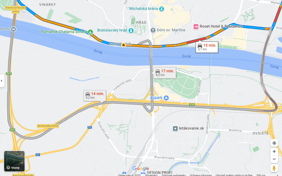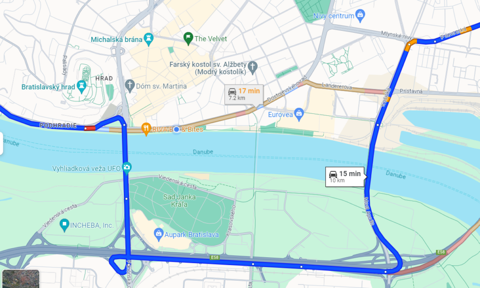 Piatok o 8.00: aj Google maps radili obísť nábrežie cez most Apollo, hoci aj tam bola zápcha