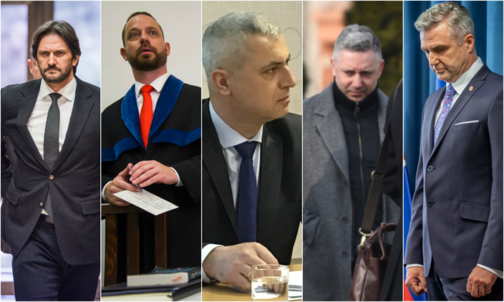 Bývalý minister vnútra Robert Kaliňák, advokát Marek Para a bývalé vedenie polície: exšéf NAKA Peter Hraško, bývalý šéf protikorupčnej jednotky Róbert Krajmer a bývalý policajný prezident Tibor Gašpar. Foto – N a TASR