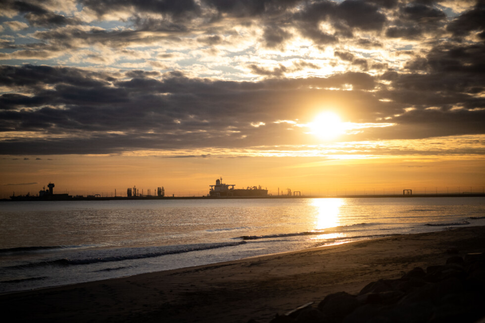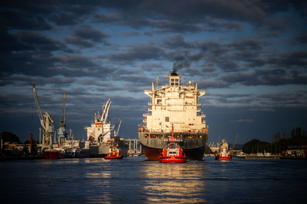 V diaľke na horizonte vidno viacero prepravných lodí, čo pripomína, že Gdansk je najväčším prístavom v Poľsku a druhým najväčším v Baltskom mori.