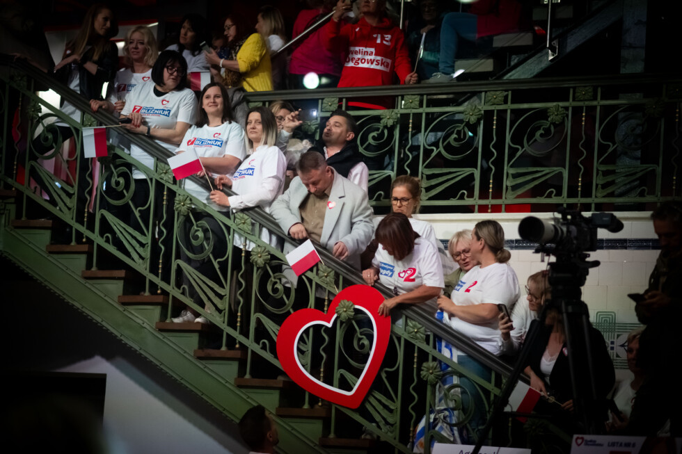 Vzadu v sále rozdáva perá a tašky aktivistka Veronika zo skupiny Je to tvoja voľba (To twój wybór). Hoci hovorí, že nie je voličkou Občianskej koalície a bude hlasovať za Ľavicu, ktorá nie je jej súčasťou, vraví, že podobné akcie majú zmysel.
