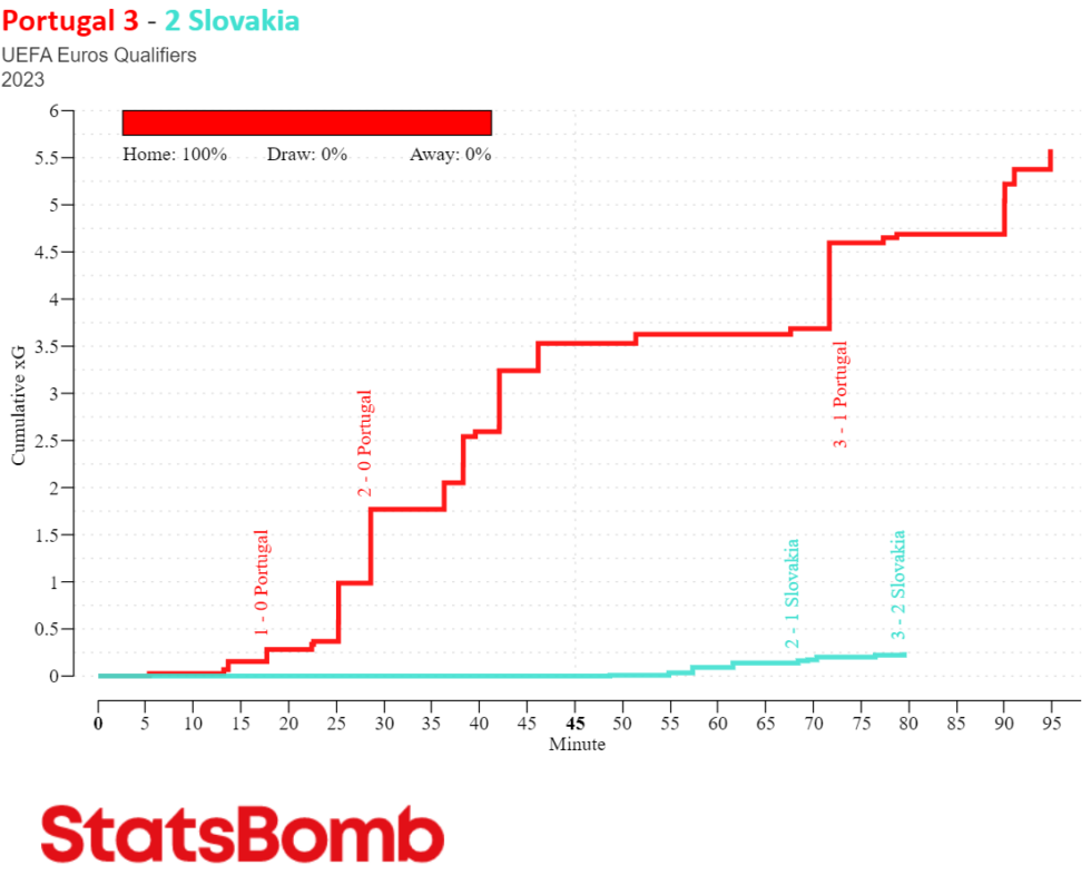 Vývoj xG počas zápasu Portugalsko – Slovensko (3:2):