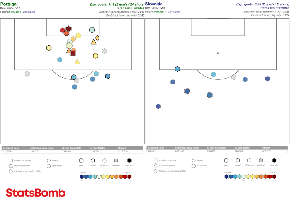 Portugalsko malo 24 striel a priemerná z nich mala xG 0,24 – 24 gólov zo 100 striel. Našich deväť striel malo priemernú hodnotu 0,02.