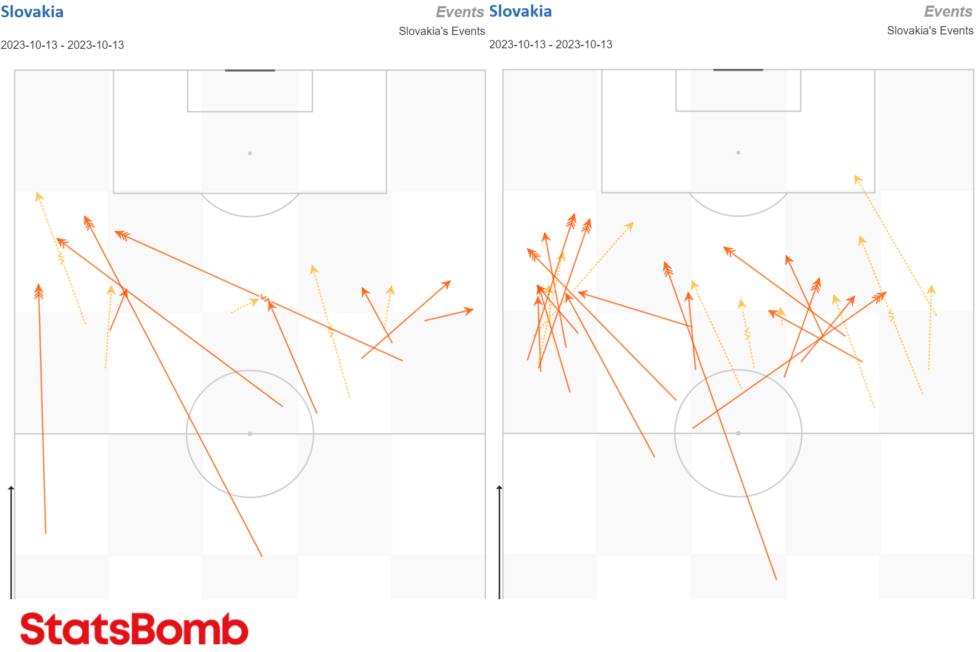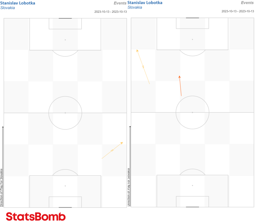 Vľavo sú Lobotkove vyvezenia lopty z vlastnej tretiny ihriska (slovom jedno), vpravo jeho vyvezenia lopty a prihrávky do finálnej tretiny (jedno vyvezenie, jedna prihrávka).