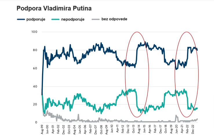 Napriek tomu je podľa renomovaných sociológov z Levadovho centra Putin populárny ako za najlepších čias. Podľa čerstvého prieskumu ho podporuje 82 percent opýtaných. Iba 15 percent má opačný názor.