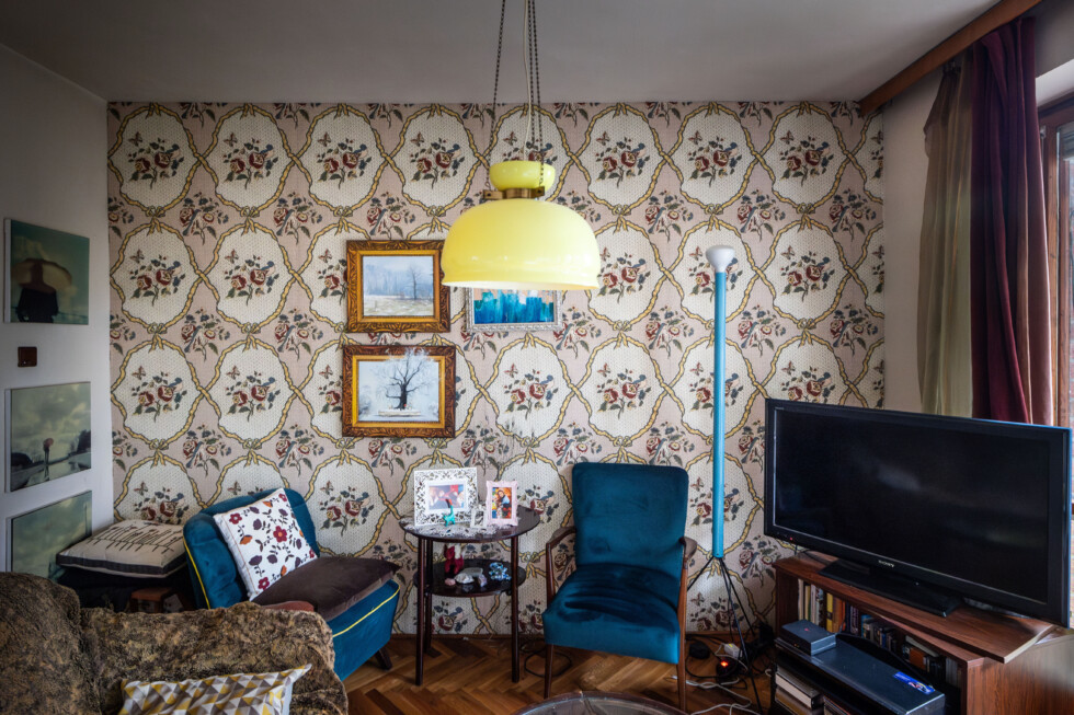 Keď sa jej rodičia do domu nasťahovali, ako prvý si kúpili rozťahovací gauč, rokmi používania sa však úplne zničil. „Bol to ich prvý kus nábytky. Kúpili si ho, aby mali kde spávať. Bol malý, túlili sa na ňom k sebe. Bola to veľká láska. Operadlá boli z preglejky a aj dnes pôsobí veľmi súčasne. Ako dieťa som ho milovala, zmestili sme sa tam celá rodina. Pozerali sme z neho filmy, ktoré otec na starej premietačke premietal na prázdnu stenu,“ spomína.