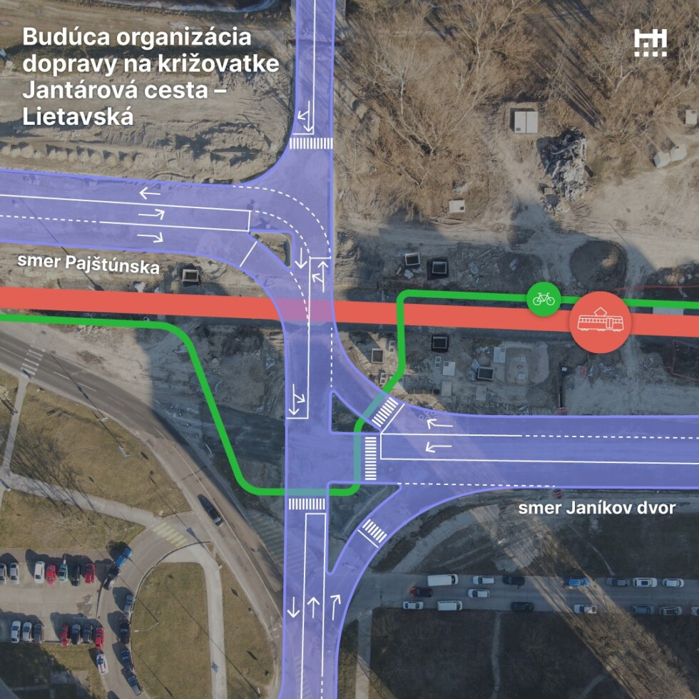 Pomohol si pritom vizualizáciou križovatky Jantárová cesta – Lietavská. Ľudia však v komentároch rýchlo upozornili na zvláštnu cyklotrasu. Miesto toho, aby pretínala vozovku a pokračovala zarovno s električkou, sa kľukatí a cestu križuje na troch rôznych miestach.