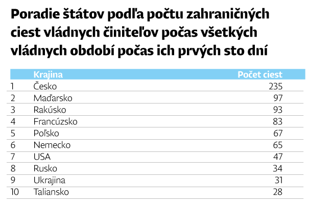 Z dostupných údajov o zahraničných cestách vládnych činiteľov vyplýva, že prvých 100 dní súčasnej vlády sa vyznačuje menšou zahraničnopolitickou intenzitou v porovnaní s predošlými vládami za rovnaké časové obdobie prvých 100 dní.