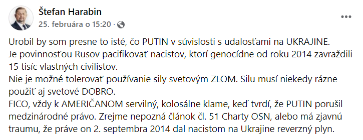 Jedným z mála politikov, ktorý si po celý čas udržal jednu líniu, je prezidentský kandidát Štefan Harabin. Aj krátko po začiatku invázie napísal na Facebook, že by „urobil to isté, čo Putin“. Agresiu obhajoval rovnako ako Moskva: na Ukrajine sú nacisti, ktorí údajne vraždili Rusov, a ešte aj kritizoval Fica.