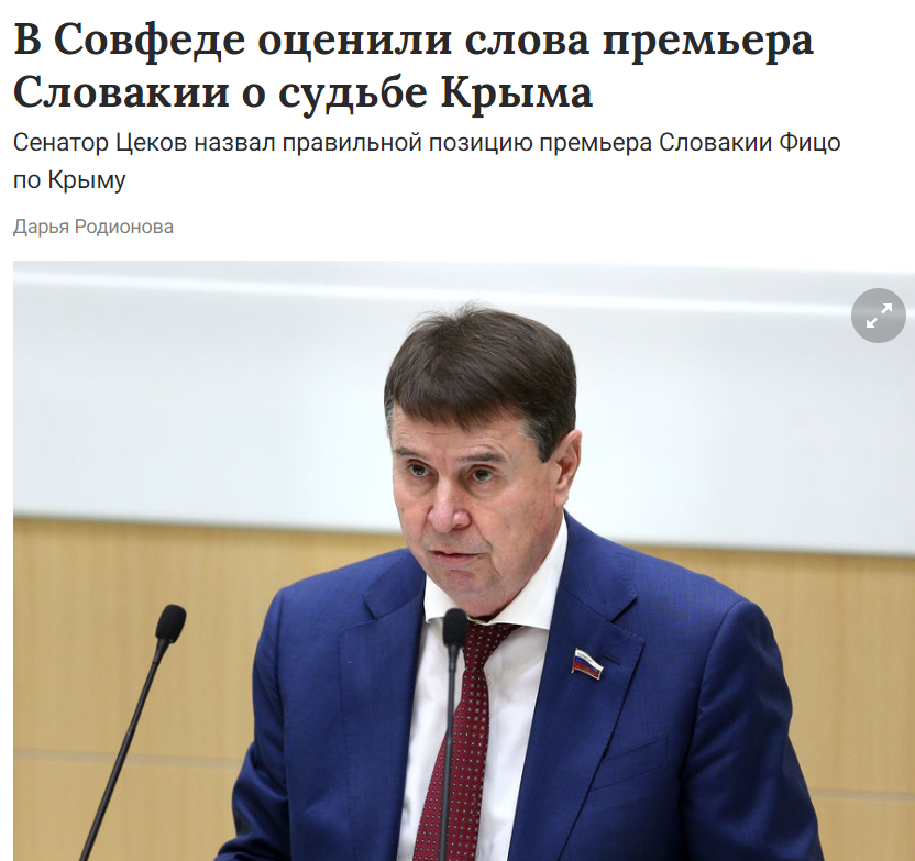 Tieto slová vyzdvihol aj často citovaný kolaborant a senátor za okupovaný Krym Sergej Cekov. Slovenský premiér podľa neho pochopil, že Ukrajina a jej spojenci skončia „v tábore porazených“. „Fico zaujal správny postoj ku Krymu a Donbasu. Tí, ktorí tvrdia opak, len preukazujú svoju menejcennosť,“ povedal Cekov.