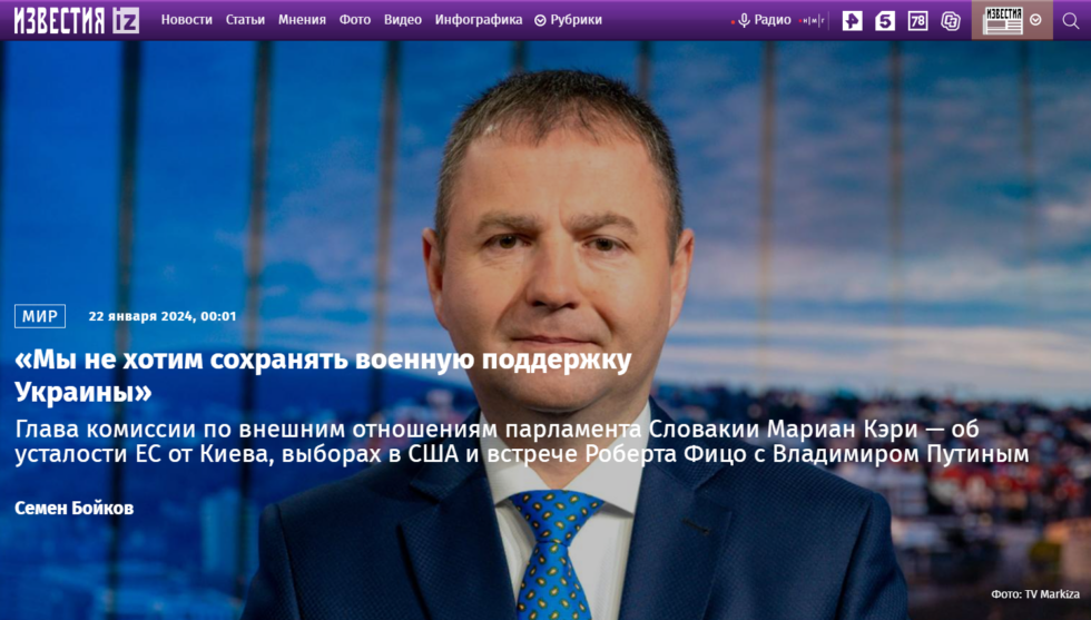 O to cennejšie pre Rusov je, ak sa môžu oprieť o citáty politikov, ktorí majú aj vládnu moc. Zvlášť na Slovensku nachádzajú takýchto respondentov relatívne dosť. Denník Izvestija publikoval už v januári rozhovor s poslancom a predsedom zahraničného výboru Marianom Kérym (Smer). „Nechceme pokračovať vo vojenskej pomoci Ukrajine,“ znel titulok.