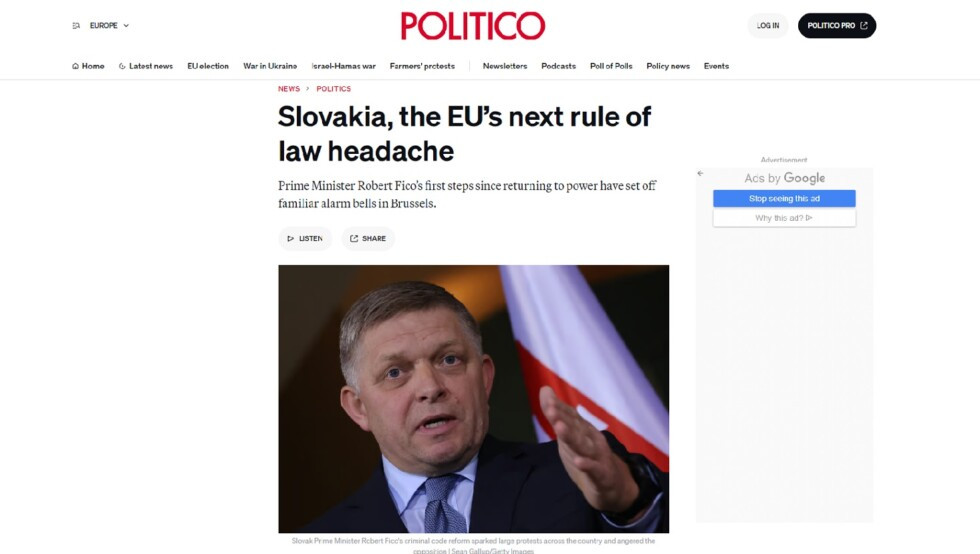 „Premiér Robert Fico sa stáva problémom,“ znie prvá veta textu o Slovensku na webe Politico s titulkom „Slovensko, ďalší bolehlav EÚ v otázke právneho štátu“.