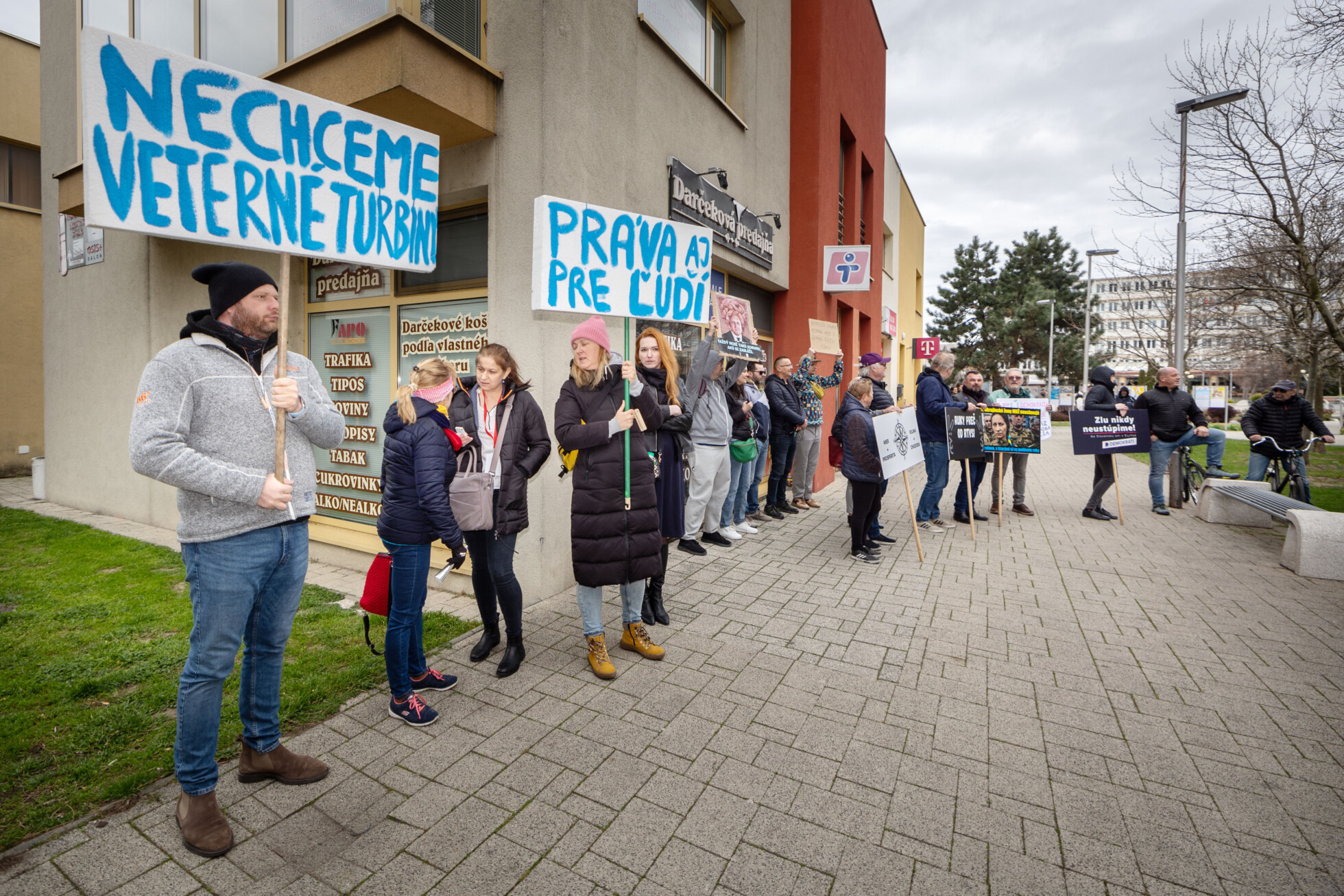 „Veterné turbíny tu nechceme!“ kričali protestujúci.