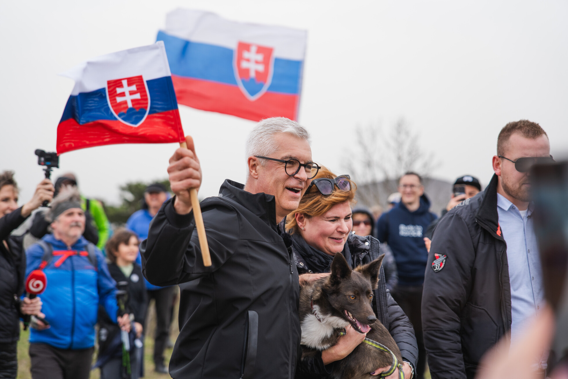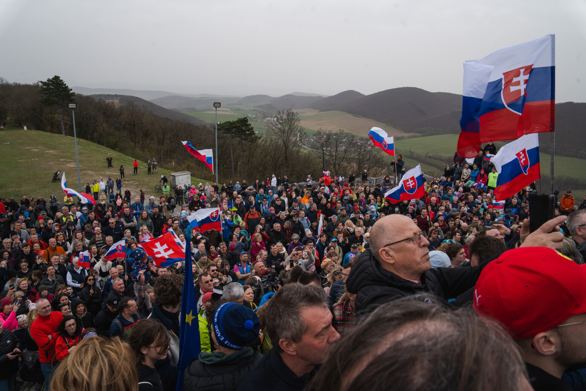 Keď skupinka príde na Bradlo, kandidáta tam čakajú stovky priaznivcov so slovenskými a s európskymi vlajkami. „Korčok na Hrad,“ skandujú podobne ako na ostatných mítingoch, i keď prezident v skutočnosti na Bratislavskom hrade nesídli. Úraduje z paláca na Hodžovom námestí.