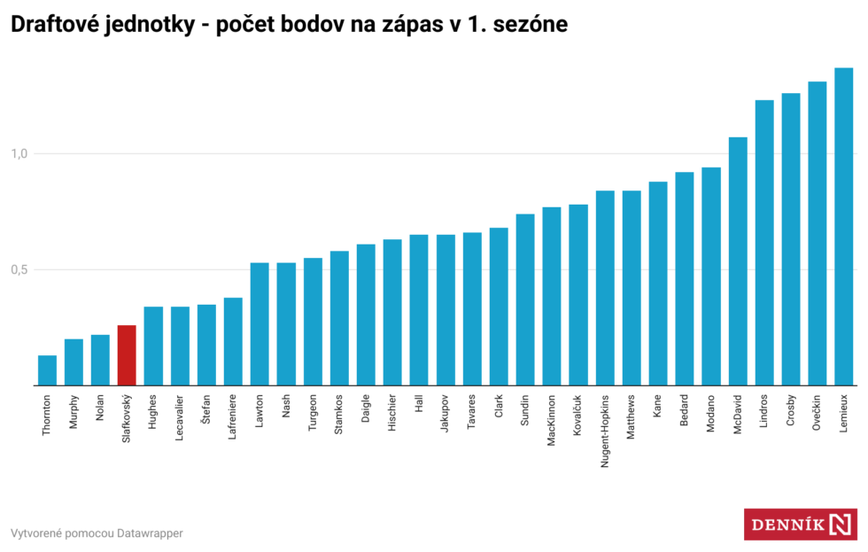 Slafkovského preto porovnávame len so všetkými 30 útočníkmi, ktorí boli draftovými jednotkami od roku 1983. Z porovnania sme vynechali ôsmich obrancov a dvoch brankárov.