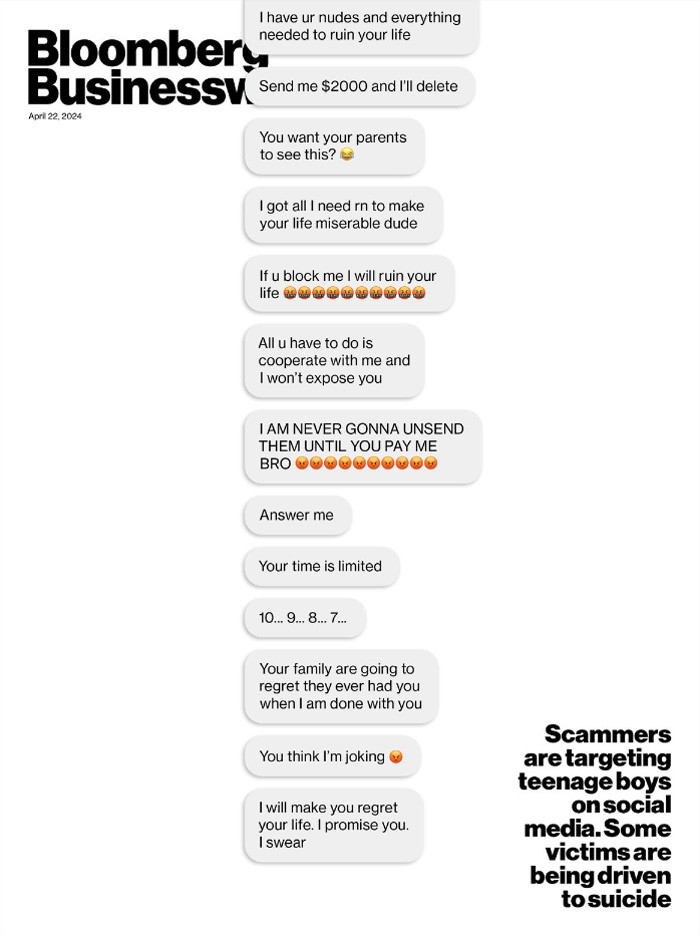 Téme sexuálneho vydierania detí venoval časopis Bloomberg Businessweek aj titulnú stranu. Všetky uvedené správy sú doslovné a pochádzajú zo skutočných prípadov či návodov pre zločincov.