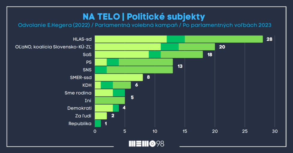 - Najčastejšie boli v diskusiách politici zo strany Hlas (65-krát), nasledovali SaS (53), Slovensko (ex-OĽaNO, 45) a Smer (39).
