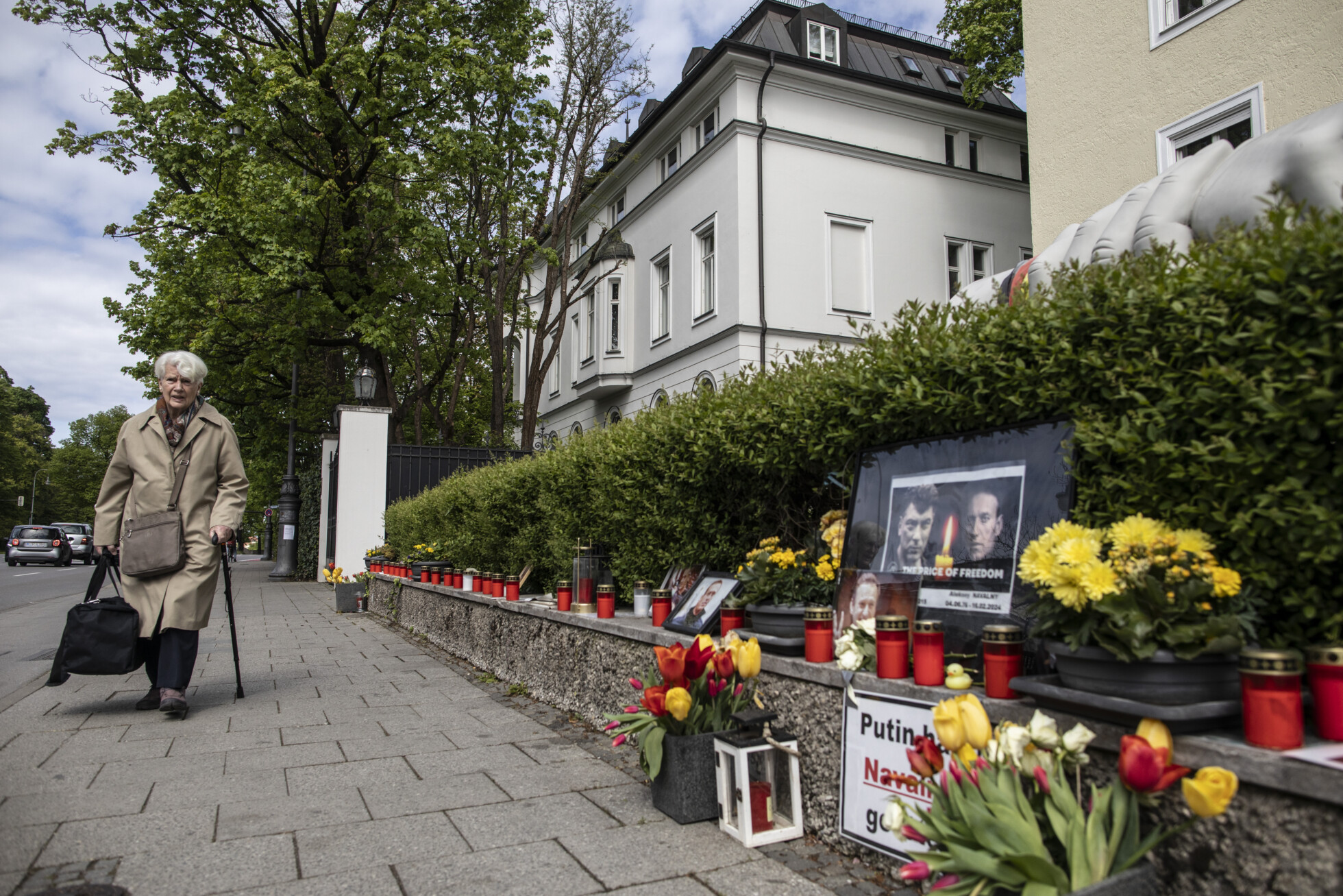 Úplne prázdna a zadebnená je aj budova ruského konzulátu, ktorého pracovníkov poslala berlínska vláda domov v reakcii na ruskú agresiu proti Ukrajine. Na dome je niekoľko červených fľakov od farby, ktorú naň niekto chrstol ako výraz toho, že Rusi majú na svojich rukách krv. O kúsok ďalej sú v tráve zabodnuté ukrajinské vlajky a tváre zavraždených ruských opozičníkov.