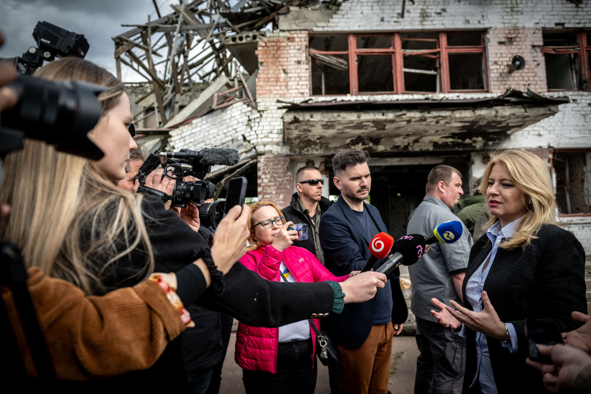 „V celej oblasti bolo zničených 11-tisíc budov, z toho 4-tisíc v meste,“ rozpráva gubernátor oblečený vo vojenskej zelenej, podobne ako zvykne nosiť prezident Volodymyr Zelenskyj, ktorého navštívila prezidentka deň predtým v jeho prísne stráženej kyjivskej rezidencii.