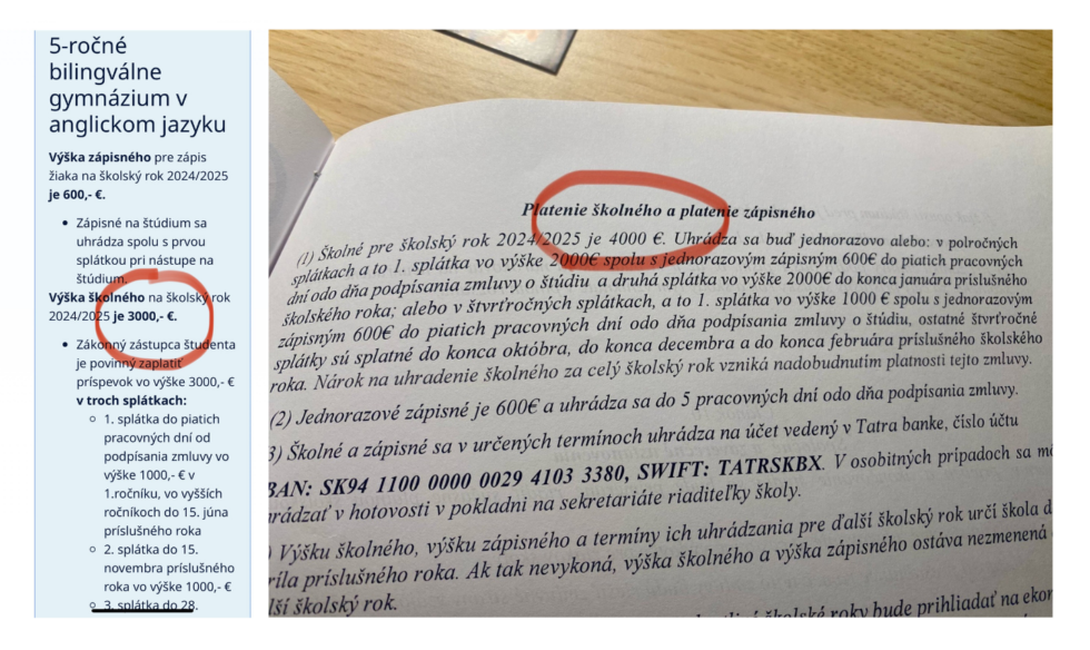 Kým čakali na jej zástupkyňu, dostali do ruky zmluvu o nástupe, ktorú si mohli preštudovať. Tam si všimli, že suma za školné je zrazu o tisícku vyššia, teda štyritisíc eur. Na webstránke školy je pritom do publikovania článku naďalej uvedené, že školné na nasledujúci školský rok je vo výške tritisíc eur.