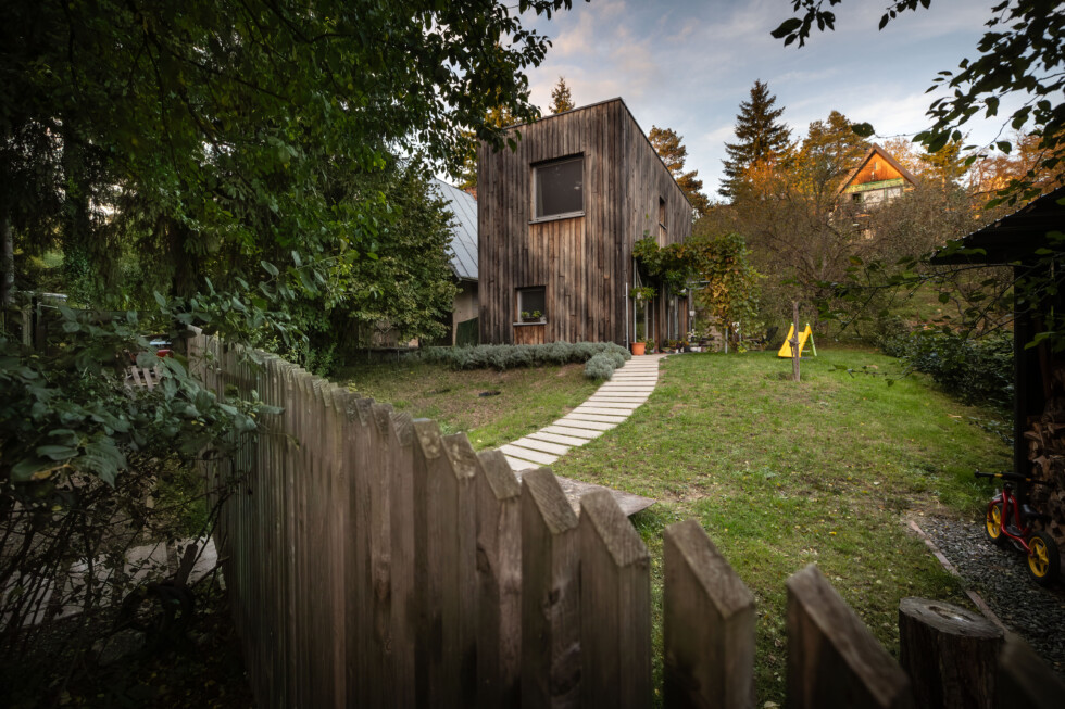 Dom situovali v prednej časti pozemku, pôvodná malá chatka sa nachádza hore na kopci.