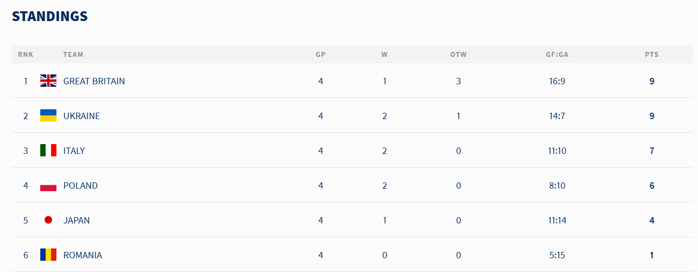 Ukrajinci ako nováčik v „béčku“ najskôr uhrali bod s Veľkou Britániou (3:4 p. n.) a potom porazili Taliansko (3:2 p. n.), domáce Rumunsko (4:0) aj Poľsko (4:1). Pred záverečnými zápasmi tak majú v tabuľke deväť bodov, rovnako ako Veľká Británia a o dva viac než tretie Taliansko.