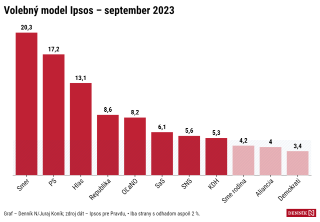 Smer je stále prvý s 20,3 percenta, druhé PS má 17,2, hnutie Sme rodina Borisa Kollára by skončilo mimo parlamentu, ukazuje prieskum Ipsosu pre Pravdu. Ak by voľby dopadli ako tento prieskum, problém zostaviť vládu by mali Smer aj PS.