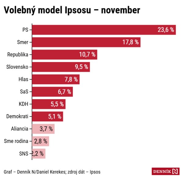 PS má v prieskume Ipsosu najvyšší doterajší výsledok 23,6 percenta, Smer ďalej mierne klesá na 17,8 percenta. Na historické minimá sa dostal Hlas, je až piaty. Silní sú Republika a Matovič.