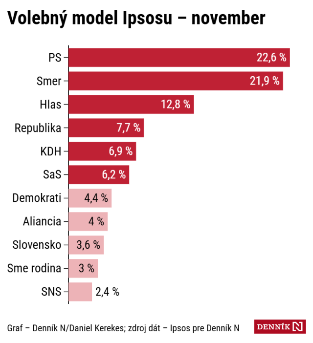 Najnovší model Ipsosu: PS prvý raz predbehlo Smer, ktorý medzimesačne stratil takmer 4 percentuálne body. PS by získalo 22,6 %, Smer 21,9 %, Hlas 12,8 %, Republika 7,7 % a SNS by nemala ani 3 %. Vyzerá to tak, že časť voličov Smeru odchádza k Hlasu a časť k Republike.