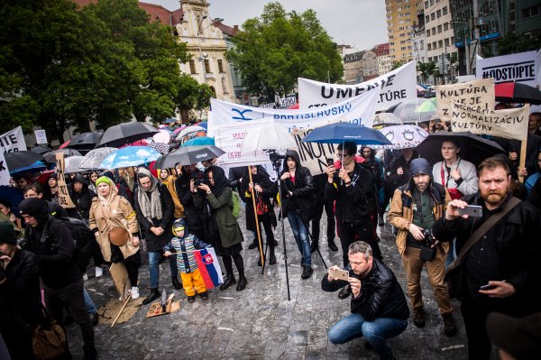 Na Námestí SNP v Bratislave sa schádzajú desiatky účastníkov protestu za odvolanie ministerky kultúry Ľubice Laššákovej aj napriek intenzívnemu dažďu.