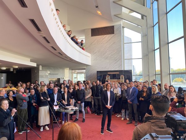 Naživo: Na tlačovom brífingu Mateja Drličku v SND je viac zamestnancov a umelcov než novinárov. Prišli vyjadriť podporu riaditeľovi Matejovi Drličkovi, ktorého sa ministerka kultúry rozhodla odvolať z funkcie.