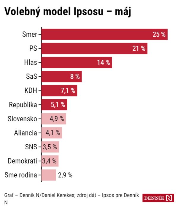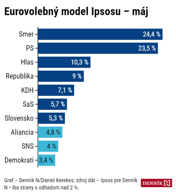 V poslednom prieskume pred eurovoľbami vedie Smer s 24,6 percenta, druhé PS má 21,9 percenta. Novinkou je, že hranicu piatich percent tesne prekročili Demokrati a Maďarská aliancia, ukazuje model Ipsosu pre Denník N.