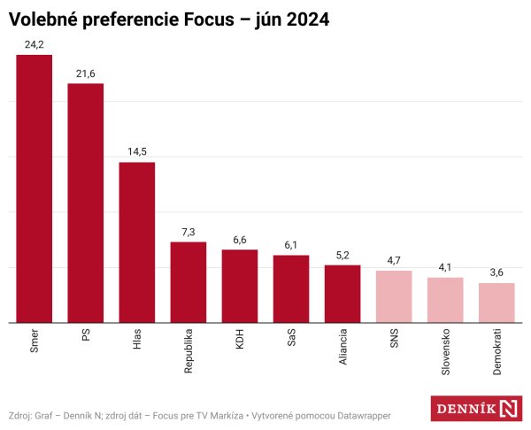 Ak by sa voľby konali v júni, vyhral by Smer s náskokom troch percent pred Progresívnym Slovenskom. Vyplýva to z prieskumu agentúry Focus pre Markízu. Tretí Hlas padol k 14 percentám. Do parlamentu by sa nedostala SNS.