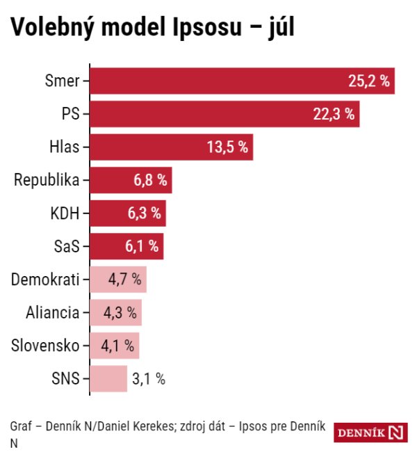 Volebný model Ipsosu: rebríček preferencií vedie Smer (25,2 %) pred PS (22,3 %) a Hlasom (13,5 %). Do parlamentu by sa dostali ešte Republika (6,8 %), KDH (6,3 %) a SaS (6,1 %), tesne by neprešli Demokrati (4,7 %), SNS by volilo len 3,1 % voličov.