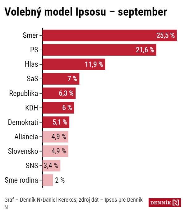 Prieskum Ipsosu: Voľby by vyhral Smer (25,5 %), druhé je Progresívne Slovensko (21,6 %). Hlas klesol na 11,9 %, v parlamente by ešte boli SaS (7 %), Republika (6,3 %), KDH (6 %) a tesne aj Demokrati (5,1 %). SNS by dosiahla len 3 %.