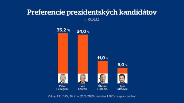 Prezidentské voľby by v oboch kolách vyhral Peter Pellegrini, ukázal prieskum Focusu pre Markízu. V prvom kole by ho volilo 34,4 % opýtaných, Ivana Korčoka 33,1 %. V druhom kole by Pellegrini dostal 56 % a Korčok 44 %.