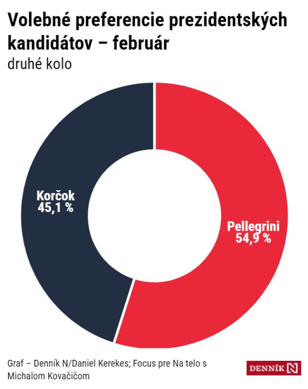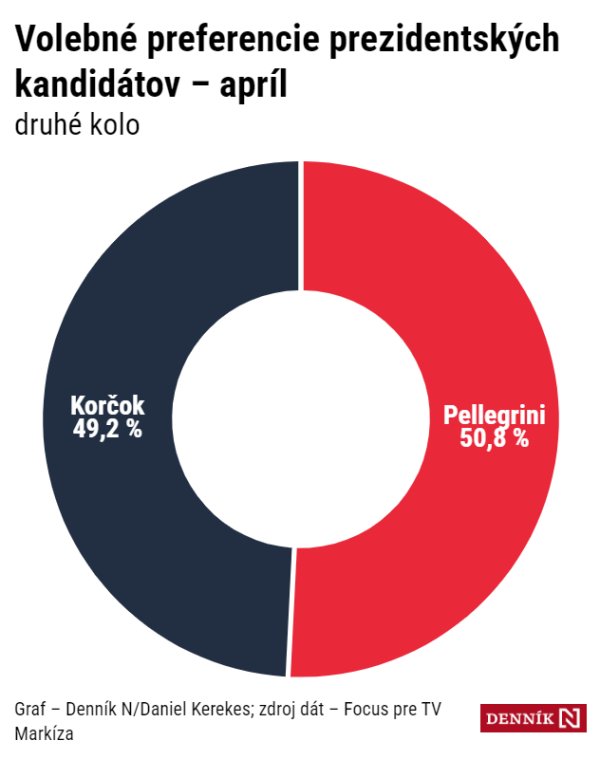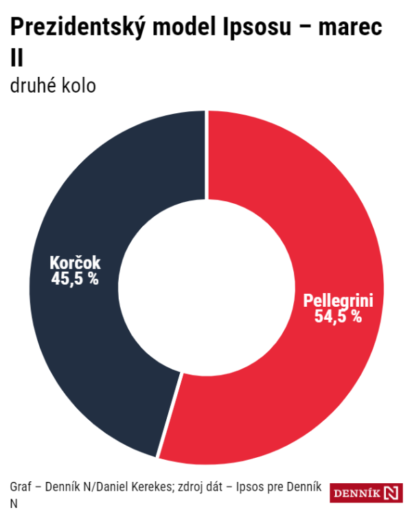 Najväčšiu šancu vyhrať prezidentské voľby má teraz Peter Pellegrini, ukazuje prieskum Ipsosu pre Denník N. V druhom kole by predsedovi parlamentu dalo hlas 40 % ľudí, Ivana Korčoka by volilo 26 %. Zvyšní respondenti nevedeli odpovedať alebo by nešli voliť.