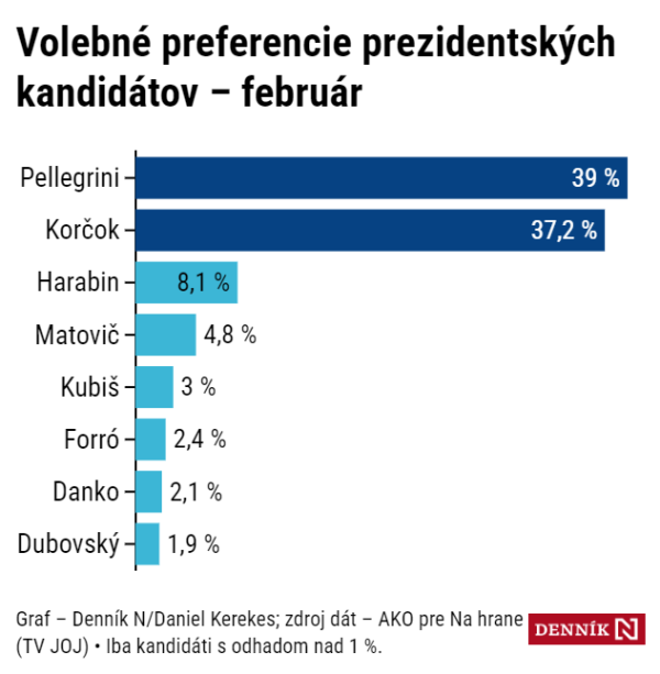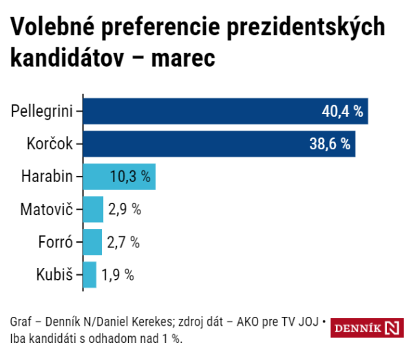 Prezidentský prieskum agentúry AKO pre Joj 24 ukazuje tesný súboj v prvom kole, Peter Pellegrini by vyhral so 40,4 percenta, Ivan Korčok by získal 38,6 percenta hlasov. V druhom kole budú kľúčoví voliči Štefana Harabina a Igora Matoviča.